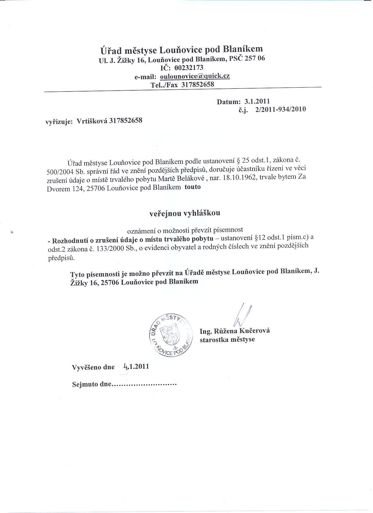 Veřejná vyhláška rozhodnutí o zrušení údaje o místu trvalého pobytu
