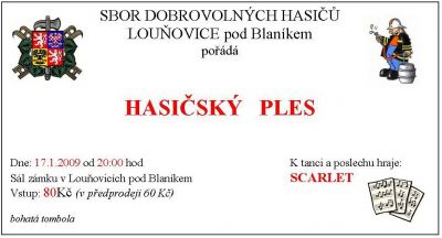 Dovolujeme si vás pozvat na tradiční hasičský ples, který se koná v sobotu 17.1.2009 od 20.00hod. v sále Louňovického zámku.