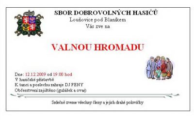 Dovoluji si pozvat všechny bratry a sestry na valnou hromadu, která se uskuteční v sobotu dne 12.12.2009 od 19:00 v hasičské přístavbě. Občerstvení a muzika k tanečku zajištěna.