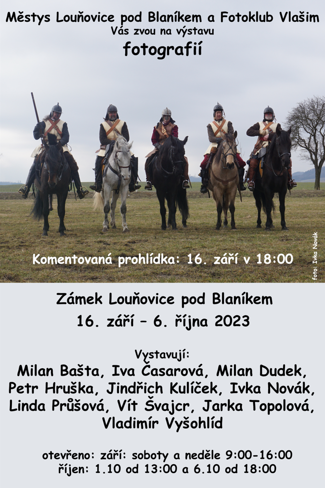 18:00 KOMENTOVANÁ PROHLÍDKA - zahájení výstavy FOTOKLUB VLAŠIM - Nenechte si ujít jedinečnou možnost účastnit se KOMENTOVANÉ PROHLÍDKY od 18 hodin a setkat se tak osobně s některými autory vystavovaných fotografií. Těšíme se na shledání!! PS: možná se někteří z Vás na některé z vystavených fotografií najdou :-).