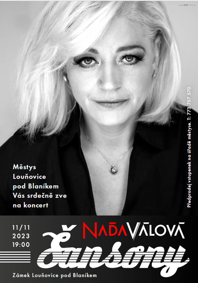 Městys Louňovice pod Blaníkem Vás srdečně zve na koncert NADI VÁLOVÉ dne 11.11.2023 od 19 hodin v zámku Louňovice pod Blaníkem. Předprodej vstupenek: Úřad městyse Louňovice pod Blaníkem (t.773 757 570). Cena vstupenky: 150,-.