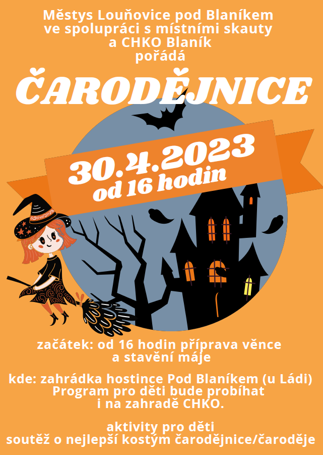 Kde: zahrádka hostince u Ládi, program pro děti bude probíhat i na zahradě CHKO. Čekají Vás aktivity pro děti, soutěž o nejlepší kostým čarodějnice/čaroděje, příprava věnce, stavění máje.