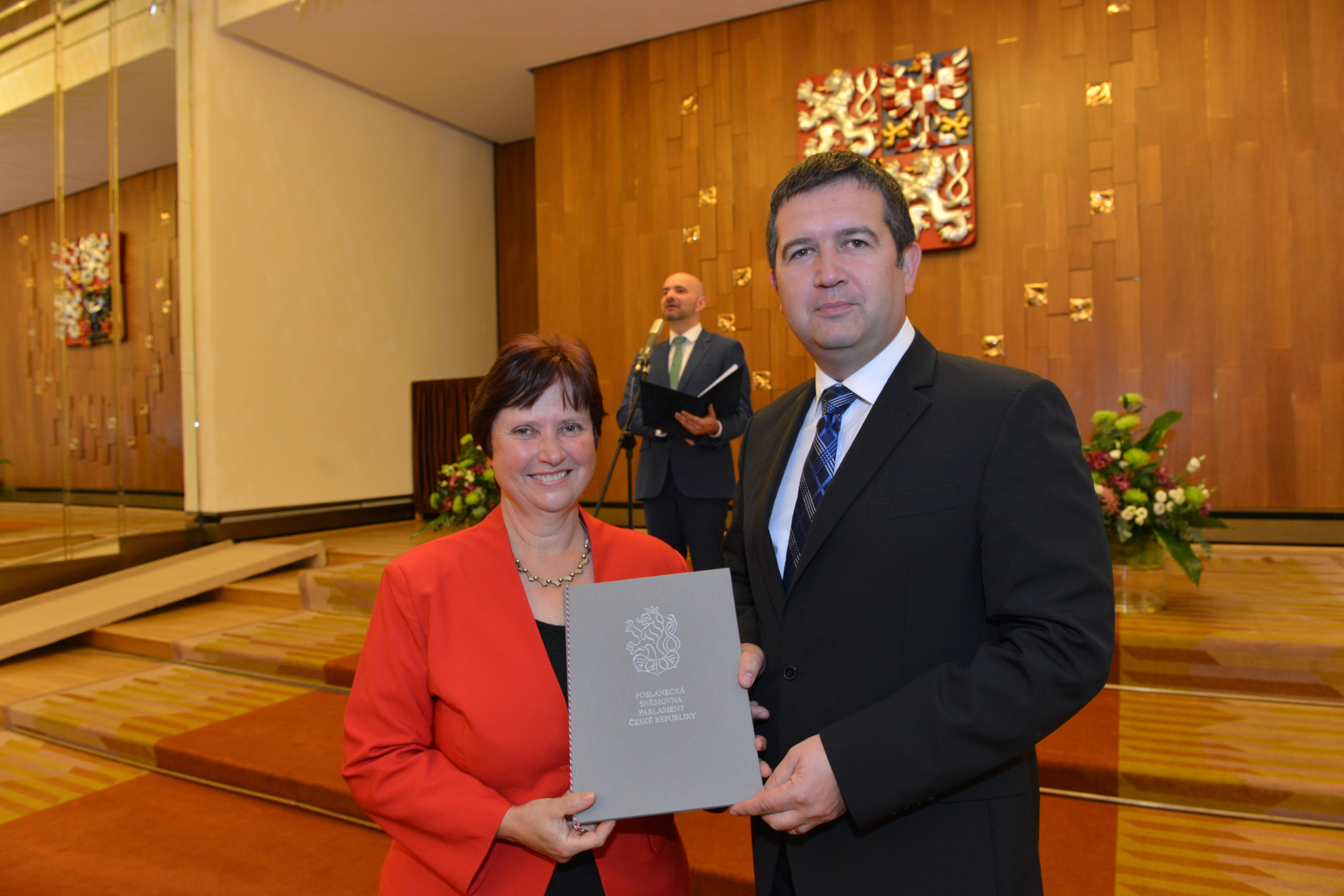 Předání v poslanecké sněmovně (starostka R.Kučerová a předseda poslanecké sněmovny p.Hamáček)