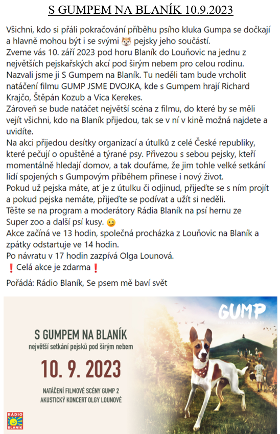 dne 10. září 2023 pod horu Blaník do Louňovic proběhne jedna z největších pejskařských akcí pod širým nebem pro celou rodinu. Tu neděli tam bude vrcholit natáčení filmu GUMP JSME DVOJKA, kde s Gumpem hrají Richard Krajčo, Štěpán Kozub a Vica Kerekes.