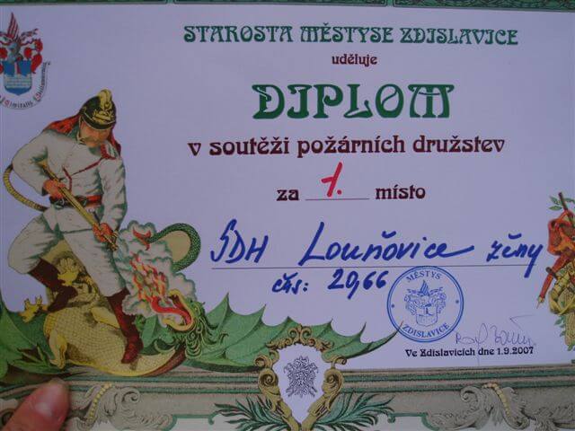 V sobotu dne 1.9.2007 se konala tradiční hasičská soutěž ve Zdislavicích. Té se bohužel v letošním roce zúčastnily jen naše sestry. Vedle mužských družstev soutěžilo 5 ženských týmů. Soutěž byla na dva pokusy a oba se mimořádně vyvedly. S časem 20,66 s jsme obsadily bezkonkurenčně 1. místo. Ale je nám jasné, že největší zásluhu na tomto krásném výsledku má náš trenér( Brčko), který s námi třikrát týdně vylepšoval novou taktiku. Takže díky, trenére!!!!!!!!