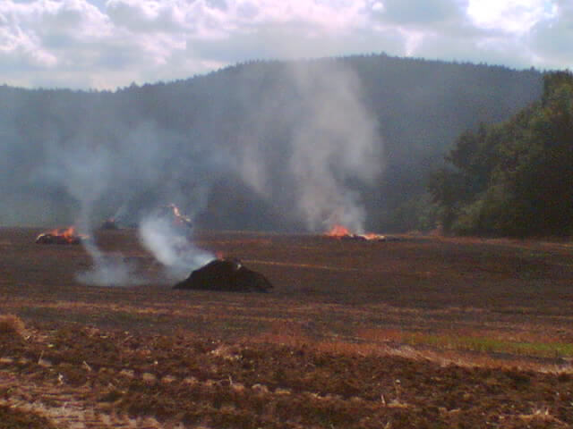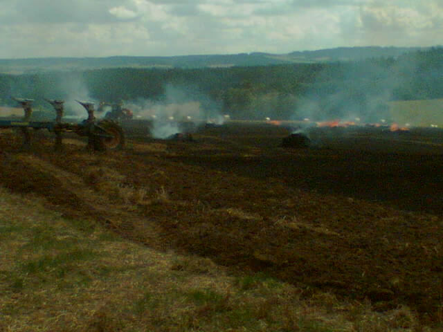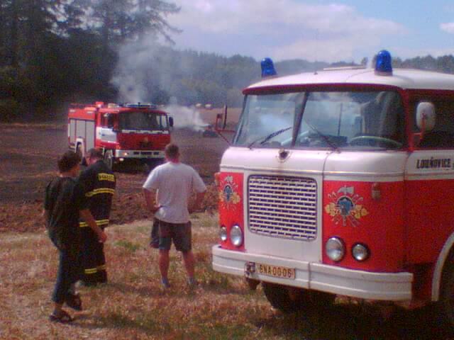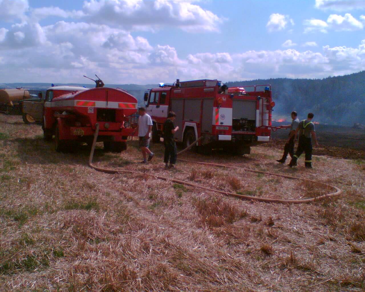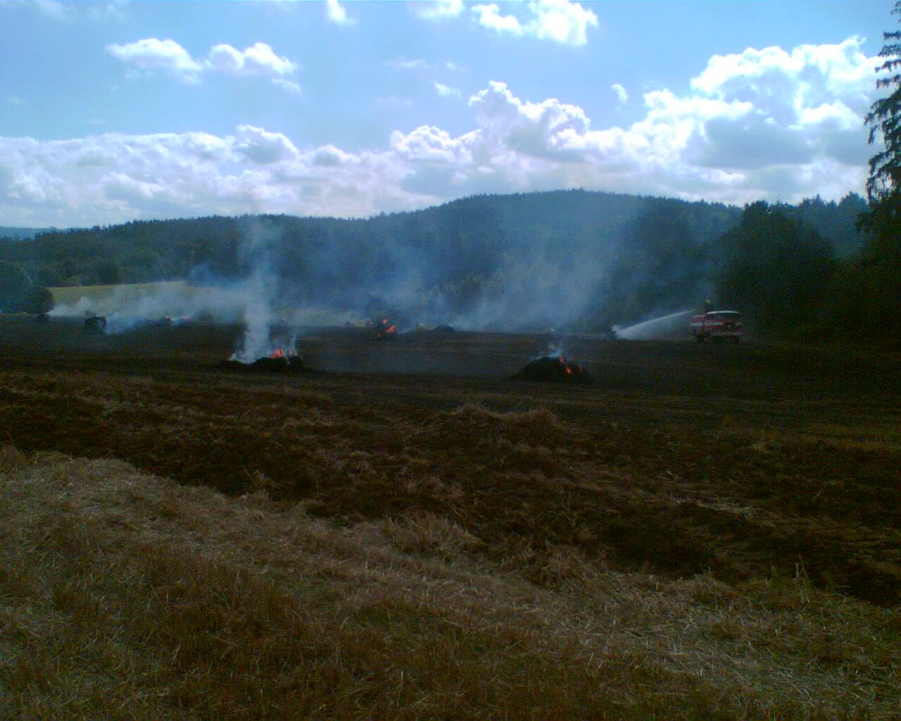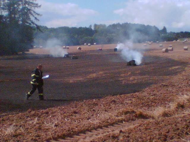 V průběhu finální přípravy soutěže na školním hřišti dne 30.8.2008 obdrželi v 10:40hod. členové jednotky SMS z centrály HZS, ve které byly sděleny základní informace l požáru. Informace byla telefonicky ověřena u operačního důstojníka a byly vyžádány podrobnější informace k místu požáru. Požár vypukl na poli ve směru od Jankova na Hlohov. Hořely tam 3-4 velké balíky slámy. Naše zásahové vozidlo již bylo připraveno k doplňování vody v průběhu požární soutěže. Vzhledem k oznámenému výjezdu se veškeré hadice musel odpojit a vozidlo s osádkou muselo jet k zásahu.