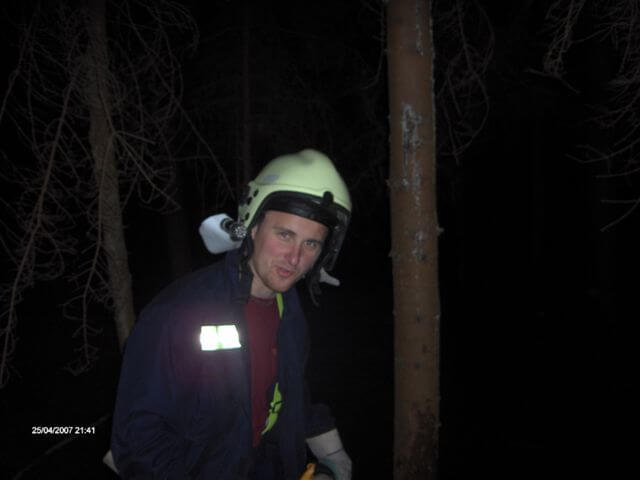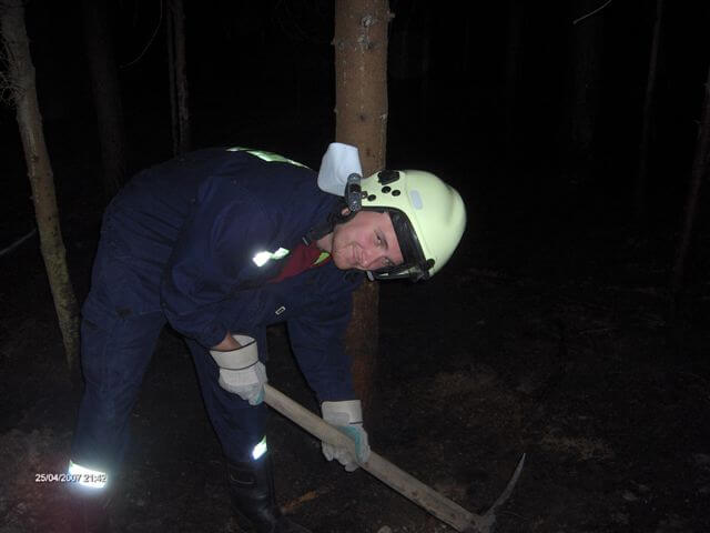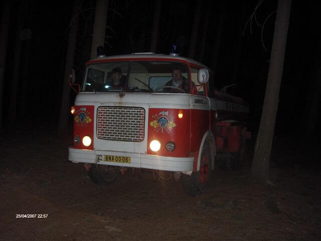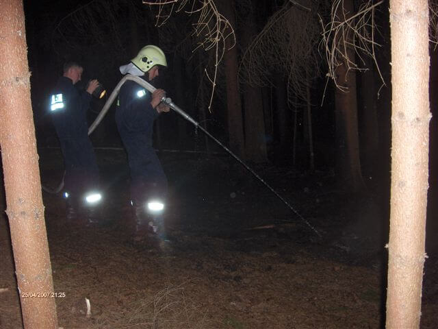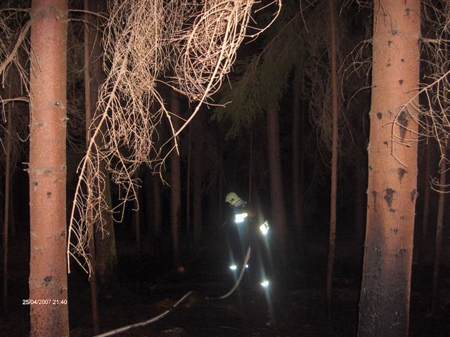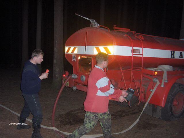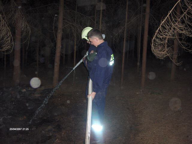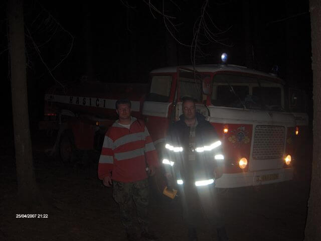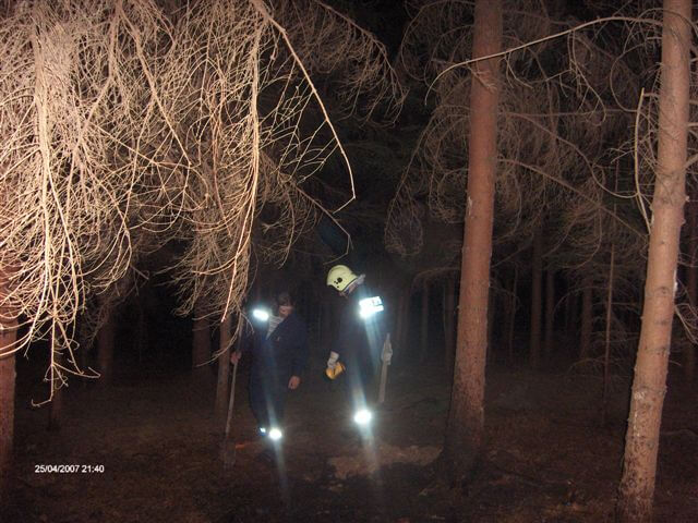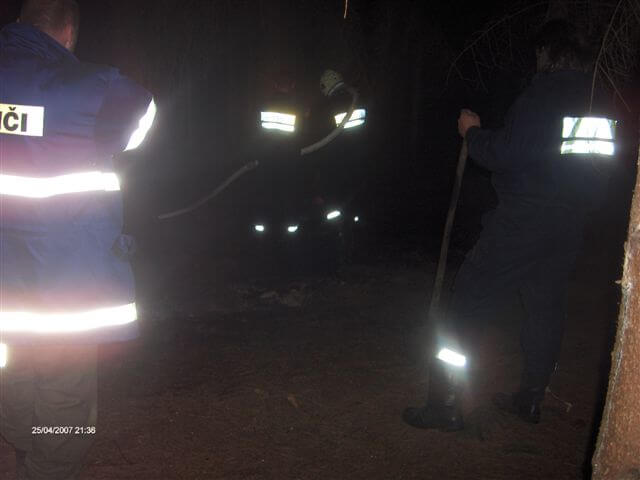 25.4.2007 21:32:07 (sms 21:37:36) ohlášení požáru lesa I.st. v lokalitě "chatová osada Smršťov". Po příjezdu jsme byli nasměrováni velitelem HZS Vlašim na lesní cestu cca 200m od sjezdu z cesty na Hrajovice. Bylo nataženo vedení čtyřech hadic C k místu s doutnající hrabankou na ploše cca 20x20m. Místo bylo okopáno a prolito vodou v množství okolo 11 kubíků. Do naší cisterny bylo nataženo zásobovací vedení celkem 120m hadic B i C které bylo zásobováno zásahovým vozem HZS Vlašim. Po důkladném prolití nebezpečných míst a okolní kontrole byl zásah velitelem HZS Vlašim ukončen v 0:10h. Návrat na základnu byl zhruba v 0:40hod. následujícího dne.